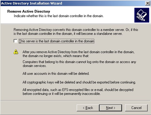 Eğer 2003 server ımızı DC olmaktan düşüreceksek dcpromo komutu ile 2003 ümüzü düşürüyoruz. Ancak This is lthe last domain controller in the domian kutucuğunu işaretlelemiz gerekiyor. Yoksa sı malum. Geçmiş olsun. 😀