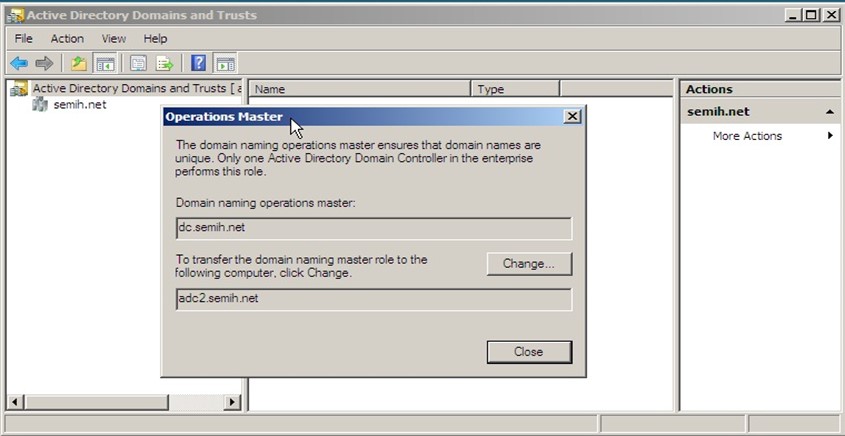 En son olarak ta AD Domains and Trust a gelip naming operations master rolünü change deyip 2008 is üzerine alıyorum. Böylece rollerin taşınmasını bitirmiş oldum.
