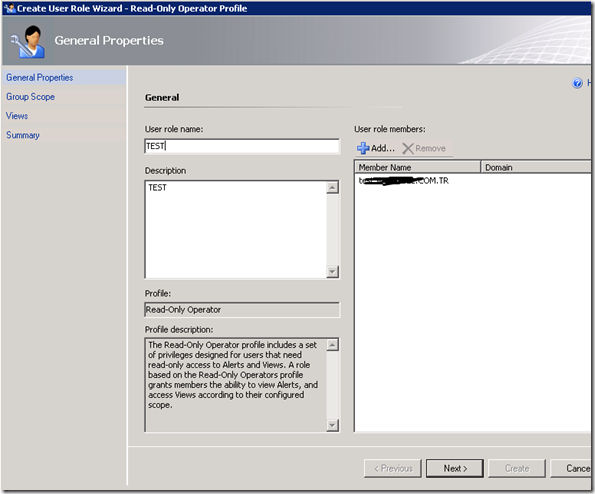 Daha sonra test kullanıcısının bilgisayarına Operations Console u kurduğumda sadece yukarıda view lerı read only olarak monitor edebilemektedir.