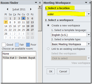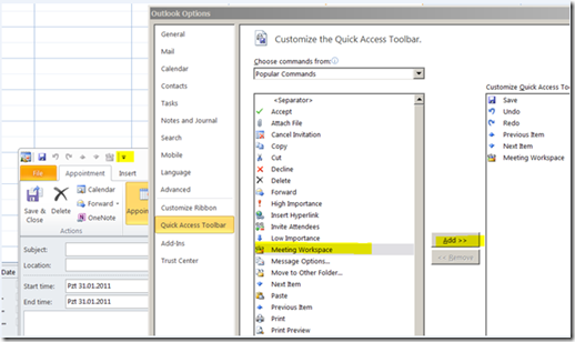 Outlook 2010 da defaultta Meeting Workspace Sekmesi gözümlkmez. Bunun için takvimde boş bir alanı tıklayıp açılan pencereden sol üst köşedeki ok a tıklayıp quick access toolbar dan meeting workspace i seçip sağ tarafa çekiyoruz.
