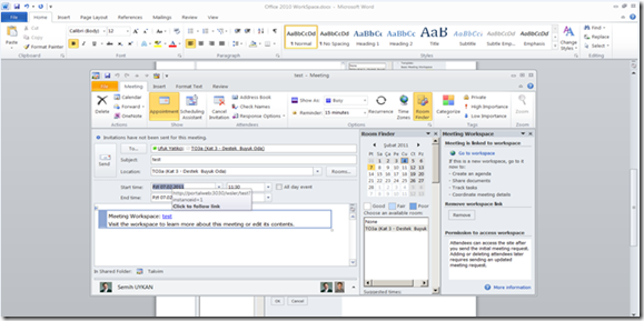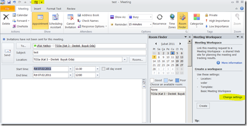 Daha sonra outlook üzerinden bir toplantı isteği gönderdiğimizde sol üst köşedeki workspace butonuna tıkladığımızda sağ tarafta meeting workspace seçeneği çıkmakta. Burada change settings diyerek outlook ta oluşturduğumuz bir meeting i MOSS 2010 üzerinden takip edebiliriz.