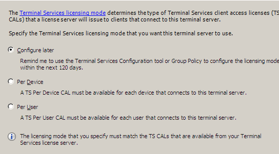 Terminal server lisanslarının kullanıcı başına mı yoksa client başına mı olduğunu seçeriz. Per device seçeneği ile aynı anda kaç bilgisayardan bu snuya bağlanılacağı, per user dan ise aynı anda kaç kullanıcının bağlanacağı bilgisi ayarlanır.