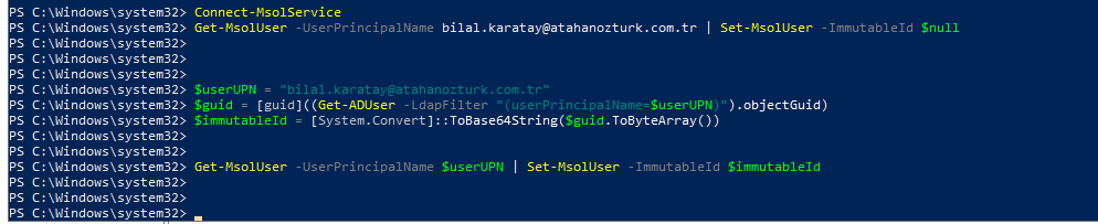Get-MsolUser -UserPrincipalName bilal.karatay@atahanozturk.com.tr | Set-MsolUser -ImmutableId $null