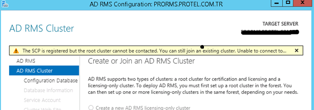 Daha önce RMS kurulmuş ve olması gerektiği gibi uninstall edilmemiş domain ortamına tekrar AD RMS kurulumu yapıldığında The SCP i sregistered but the root cluter cannot be conntected. You still ile devam eden hata alınır.