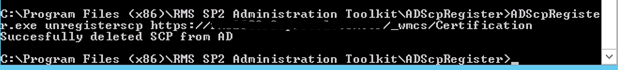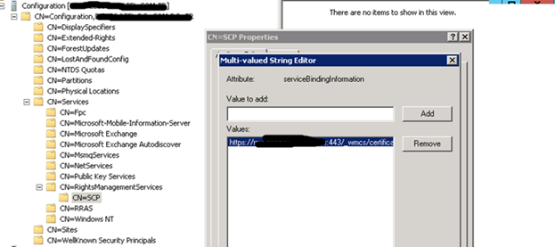 Bu hatanın alınmaması için Adsi edit ten aşağıdaki scp recordu manuel silinebilir veya RMS SP2 Administration Toolkit indirilerek var olan SCP kaydı silinir.