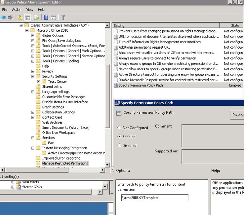 RMS kurulumundan sonra clienlera Rms Template lerini dağıtmak için Office kurulum dosyalarının içerisinde bulunan office.adm yi Ad ye import ederek GPO ile clientlara template leri yukleriz. Burada RMS sunucusunun template lerinin bulunduğu path i gostermemiz gerekmektedir.