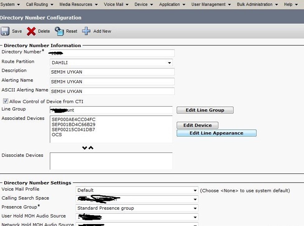 Ayarları save ledikten sonra aynı cihaza bir line eklenir. Burada dahili numarası yazılır ve diğer standart ayarları yapılır.