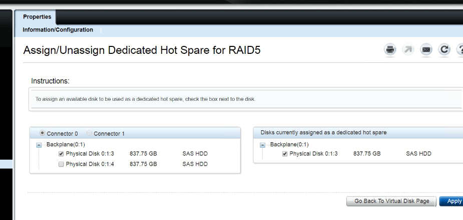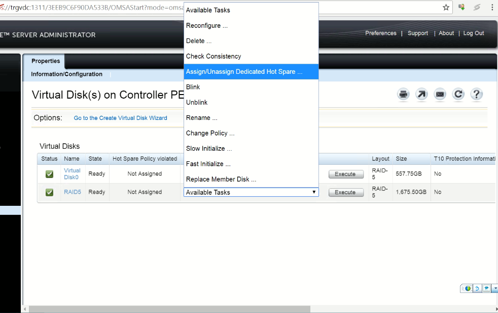 Spare olarak seçilecek disk seçilir ve virtual disk için spare disk ataması tamamlanmış olur.