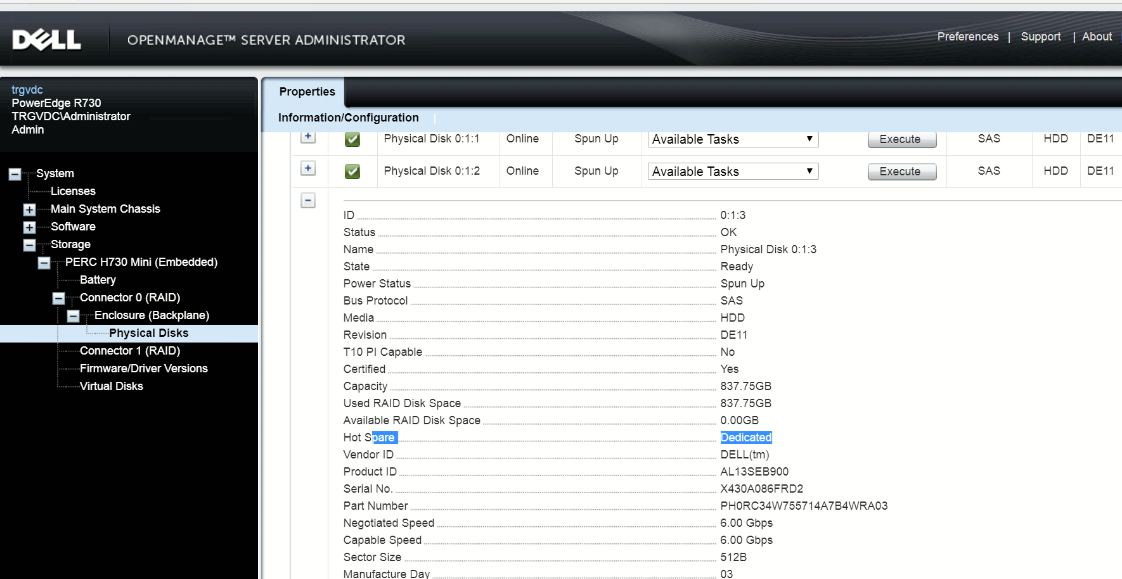 Physical disks menüsünden diskin dedicated spare olduğu görülür.