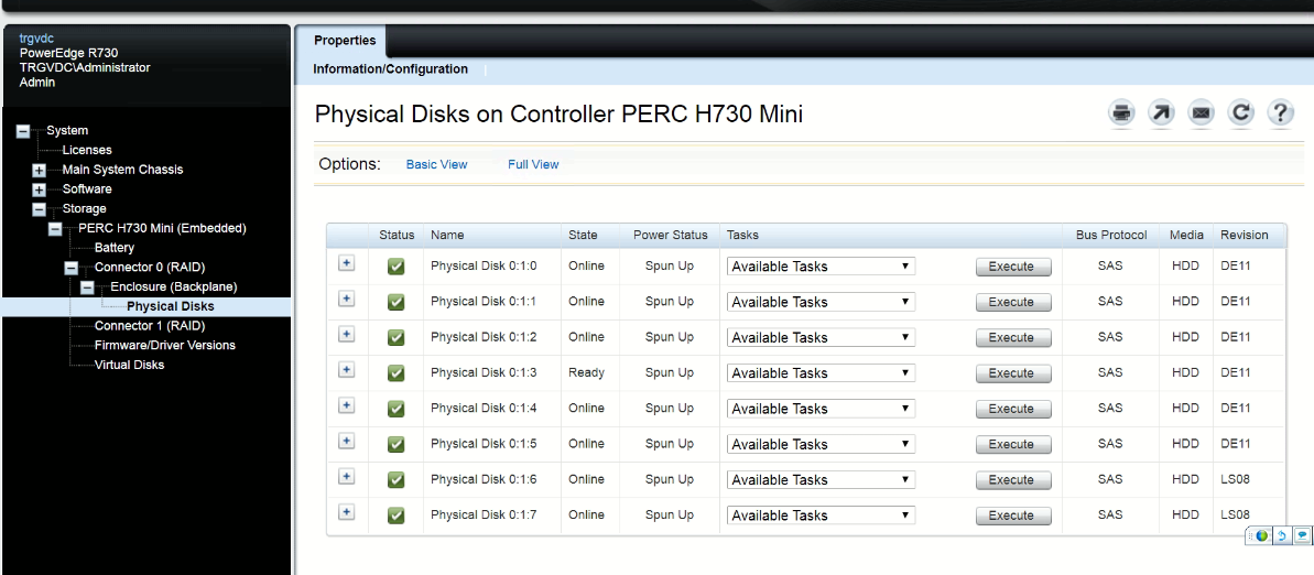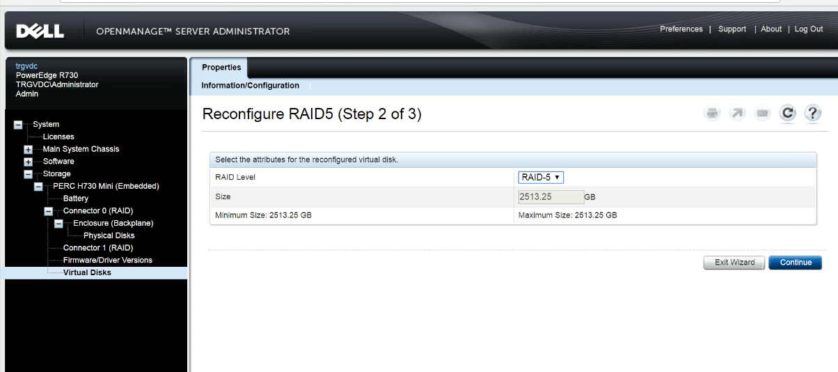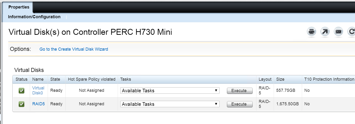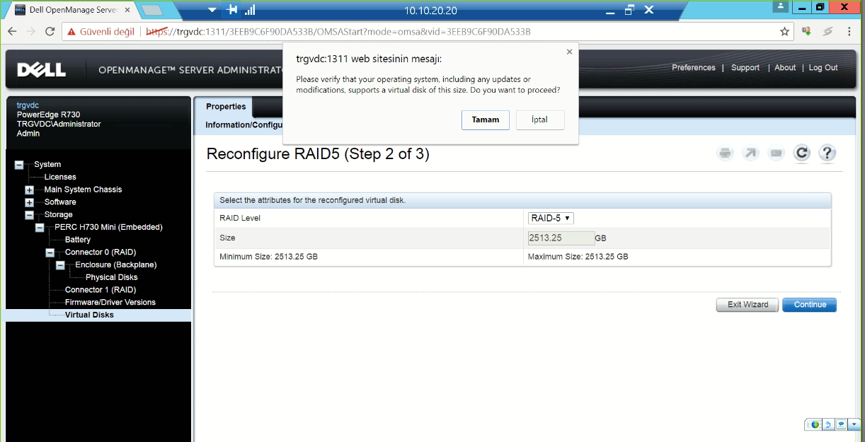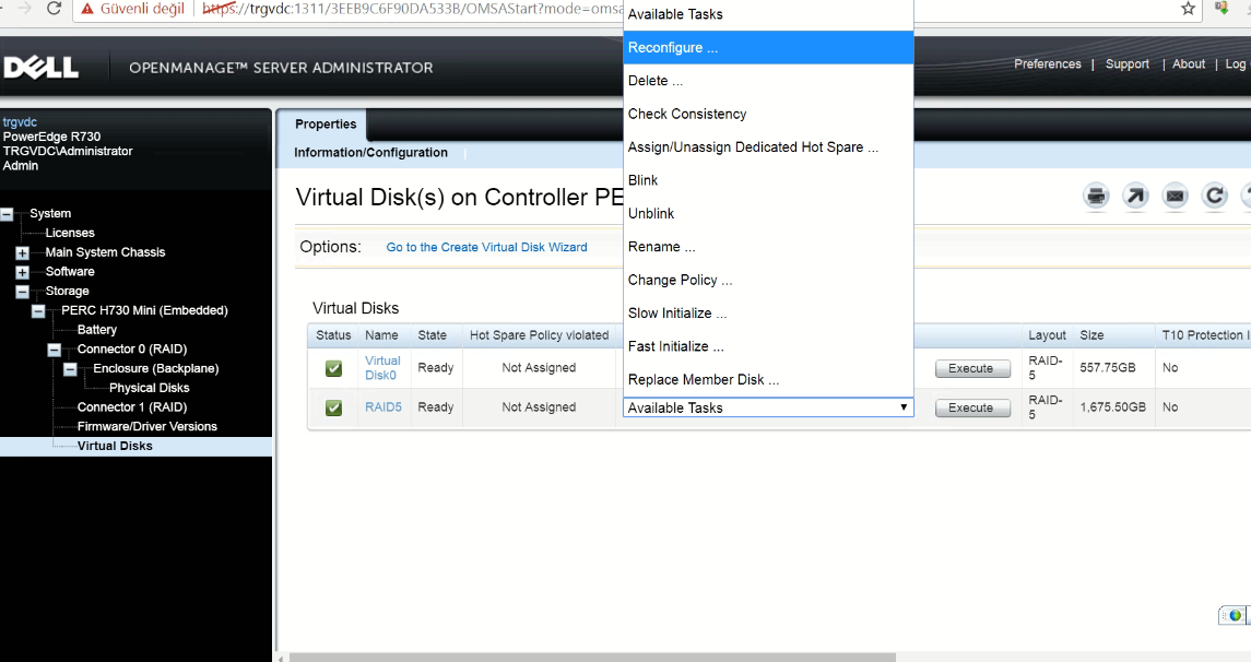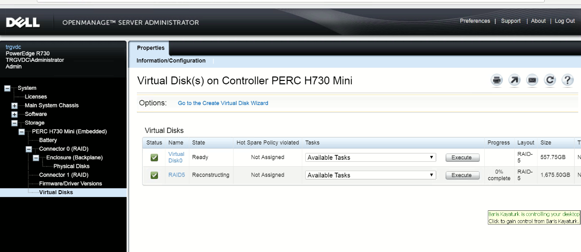 OMSA üzerinde virtual disk konfigürasyonu ile raid gurupları oluşturulur. Var olan yapıda 1 adet virtual disk bulunmaktadır.