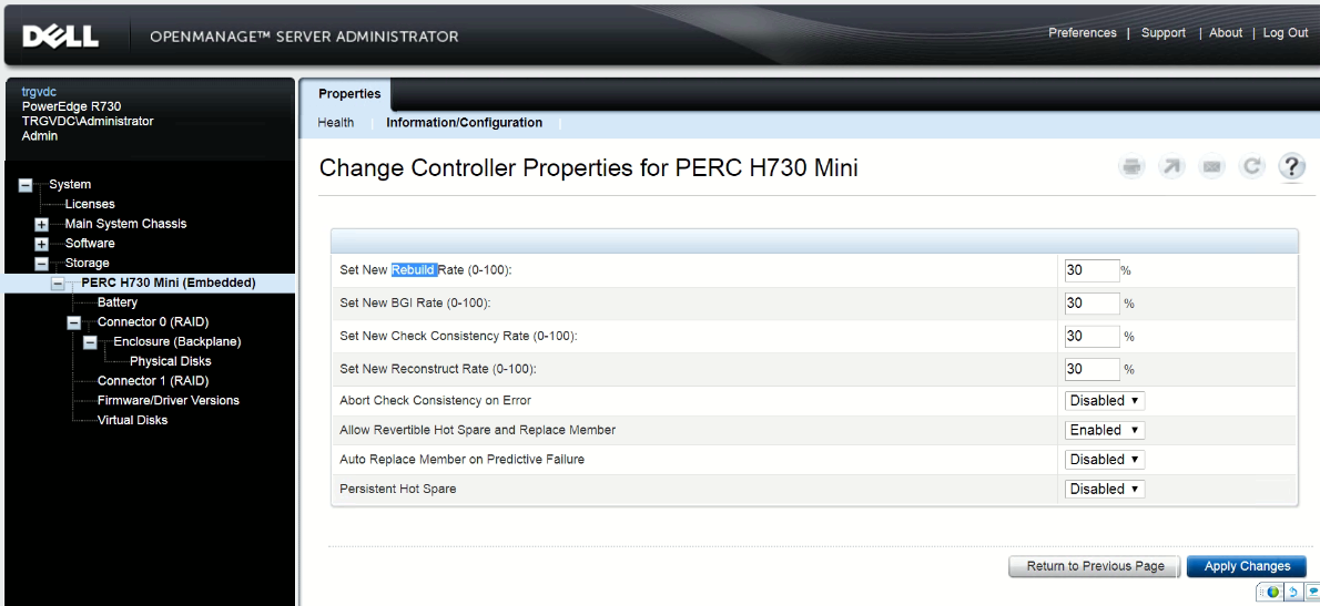 Controller ayarlarında istenirse rebuild işleminin kısa sürmesi için set new rebuid rate oranı default değer %30 dan yukarı alınabilir ancak bir değişiklik yapmamak default ayarları ile devam etmek tercih sebebi olabilir.