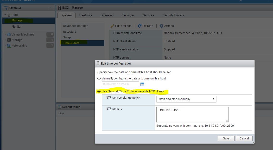 ESX host ların NTP ayarları çok kritik bir konudur. Vcenter ile yönemde, vm lerin saat ve tarih bilgilerini güncellemede, vm replikasyonlarında ve daha bir çok konuda kritik bir durumdadır. Aşağıdaki gibi ESX host NTP lerin ayarlanması gerekmektedir.