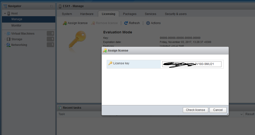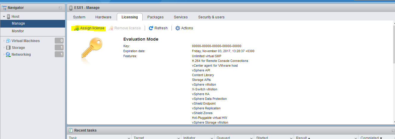 ESX host ilk kuruluşta 60 günlük deneme süresi ile gelir ve full feature lar açıktır. Lisansımızı buradan sunucuya assing ederiz.