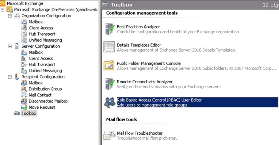 Exchange 2010 da istenilen kelimer istenilen mailbox veya mailboxlarda aranabilmektedir. Bunun için sadece ilgili kullanıcılara ilgili yetkileri vermek gerekir. EMC de RBAC ı açarak search yapmak için gerekli olan ayarları yapıyorum.