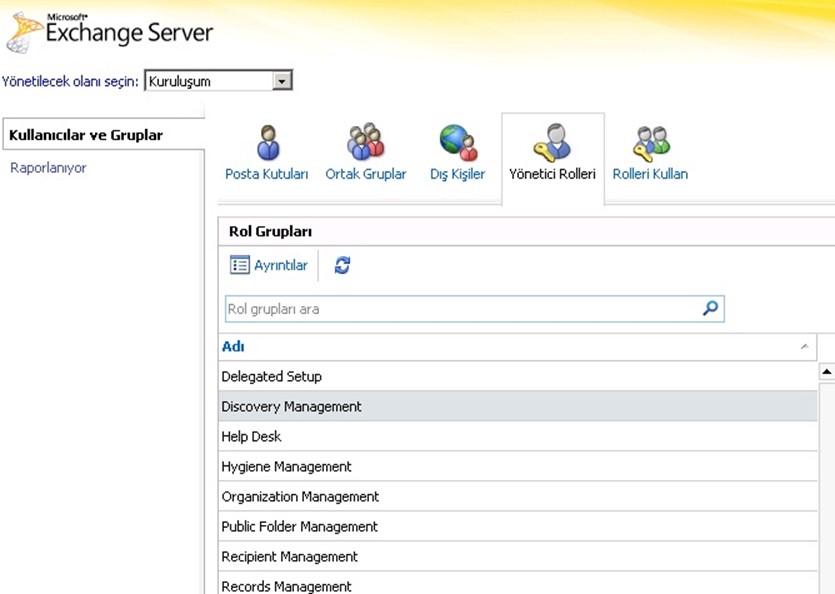 RBAC ı açtığımda bir web arayüzü karşıma gelmekte. Buradan yönetici rollerine gelerek discovery managment a gelerek arama yapmaya yetkili olan kullanıcıyı seçiyorum.