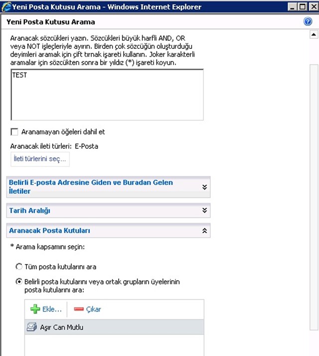 Search yaparkenki kelimeleri, hangi terihlerde ve hangi mailboxlarda search edeceğimi ayarlıyorum.