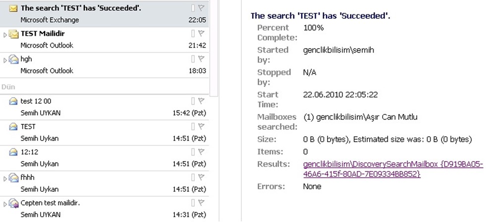 Search ayarlarını yaparken sonucun kendime mail olarak gelmesini istediğim için sonuç bana mail olarak geldi.
