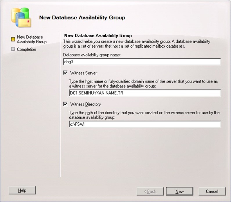 Database Availability Groups tabıne geldiğimde yeni bir DAg oluştur dediğimde bizden istenen bilgileri girip ok liyorum. Burada witness directory yi exchange sunucuların erişebileceği bir klasördür. Ben bu klasörü Hub Transport klasörü üzerinde yapıyorum. Klasör DAG yapısı oluşturulurken DAG sunucuları kullanacaktır. server a da hub transport ve client acceess role lerinin kurulu olduğu sunucumun FQDN ini yazıp DAG yapısını oluşturuyorum.