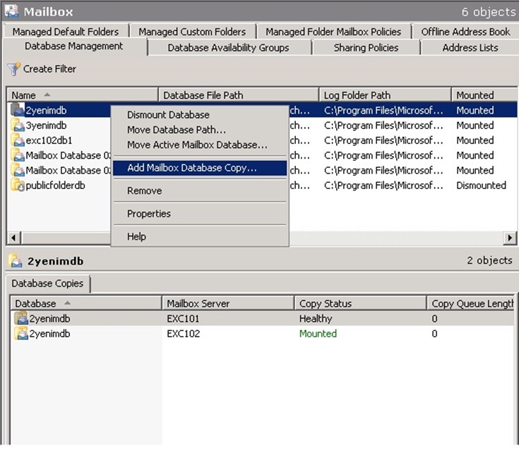 Dag yapısına exchange sunucularımı kattıktan sonra mailbox DB lerimizin hangi sunucular üzerinde duracağını belirlemem gerekiyor. Benim yapımda 1 adet DAG mevcut ve ben bu milbox DB lerimi diğer sunucum üzzerinde de bir kopyasının oluşması için seçiyorum. Bu işlemi ise aşağıdaki gibi yapıyorum. mailbox db lerim böylece her 2 sunucuda da oluşmuş oldu. Ben aşağıdaki gibi DB lerimi kopyaladım.
