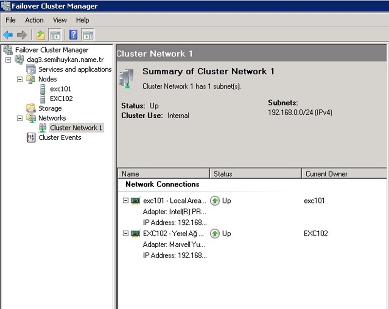bu aşamdan sonra 2 tane exc101 ve exc102 mailbox server larımdan biri fail olduğunda üzerindeki mailboxların bir kopyası diğer sunucu üzerinde olduğundan mail trafiğinde bir sorun olmayacaktır. DAG yapımdaki sunucu sayısını arttırarak mailbox sunucularımın fail olması mail trafiğinden ir sorun olma ihtimalini azaltabiliriz. Exchange yedeklerini alırken aldığımız yedekler mailbox yadekleridir. Yani client access sunucumuz çöktüğünde yedekte var olan bir sunucu üzerine exchange kurulumu yaptıktan sonra bir kaç ayar ile sunucumuzu ayağa kaldırabiliriz. Hub transport sunucum ile de durum aynı şekilde. network ve dns teki ayarardan sonra Exchange organizasyonundaki connector leri ayarladıktan sonra sistemimizi ayağa kaldırabiliriz. Ancak mailbox sunucumuzun fail olması durumunda ise bu işleyiş değişecektir. Bu sefer alınan yedekler sağlam mı, yedekten dönebilecekmiyiz gibi sorunlar oluşabilmekte. DAG yapısının yedeğini de DPM 2010 ile başarılı bir şekilde ayrıca alabilmkteyiz.