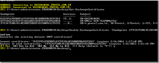 Exchange sunucularına alınan sertifikaların değiştirilmesi işlemi için shell üzerinden çalıştırılması gerek komutlar aşağıdaki gibidir.