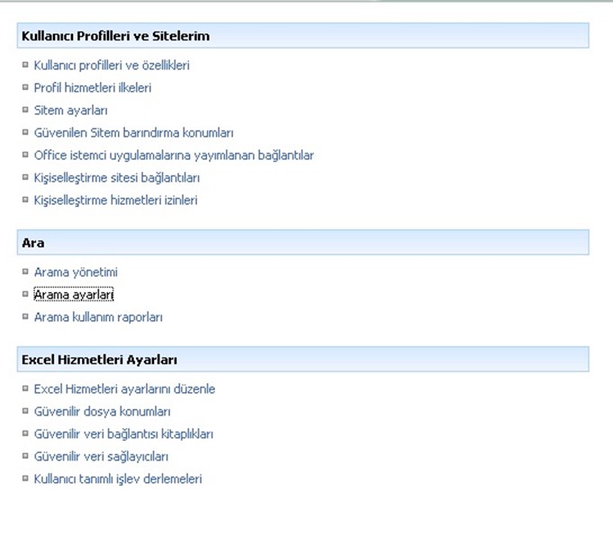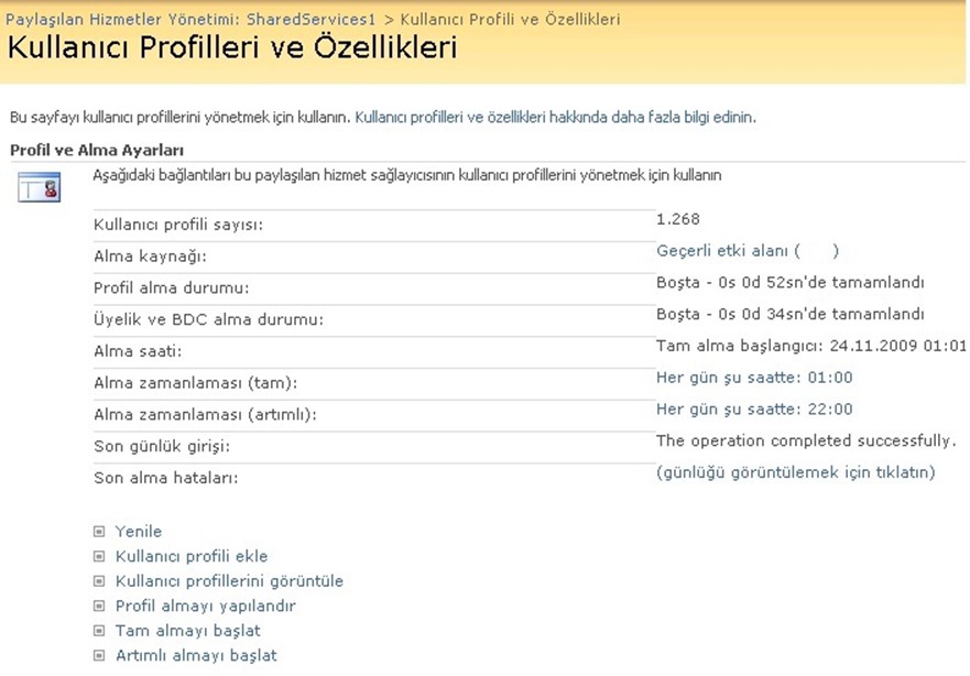 SharePoint kurulumundan sonra yapılması gerekenlerden bir tanesi de ssp den search ın ayarlanmasıdır. Bunlardan bir tanesi AD de bulunan kullanıcılarımız profillerinin Portal içine alınmasıdır. ssp den kullanıcı profilleri ve özelliklerinden profil almayı yapılandır a gelerek gerekli ayarlamalar yapılır. Otomatik olarak AD ayarlanmış olarak gelir.