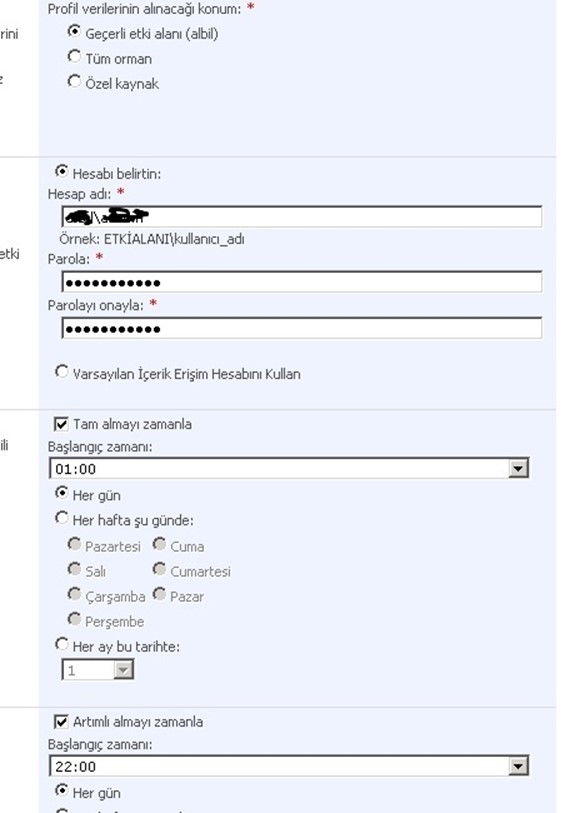 Daha sonra ise hangi sıklıklarla AD deki profilleri alacağımızı seçeriz. AD de profilde bulunan bütün attribute lar MOSS tarafından çekilir.