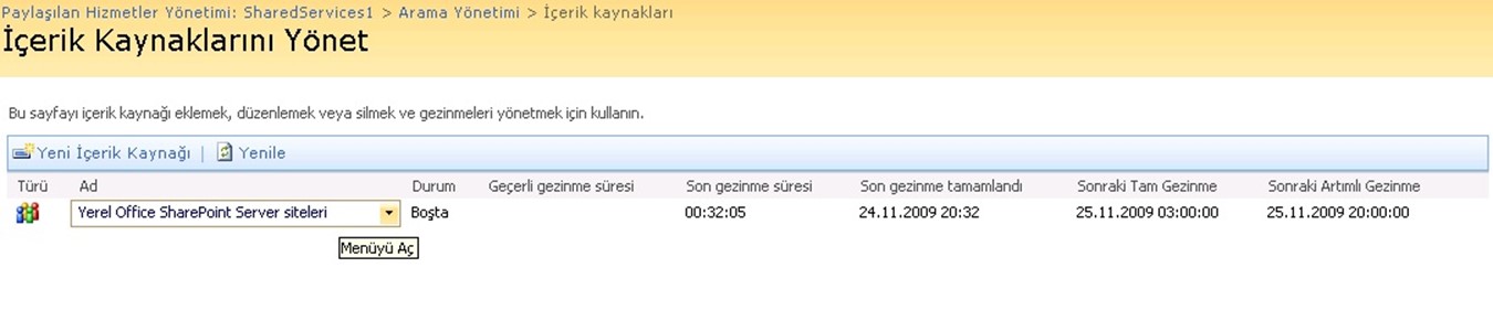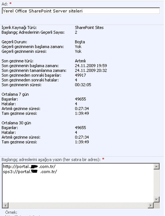 Yapacağımız ayarlardan MOSS ta oluşturduğumuz site ları başlangıç adreslerine yazarız. http://portalx.com gibi. ayrıca sps3://portalx.com ile de kullanıcı profillerini indexleyebilir veya istediğimiz bir web sitesini buraya yazarak arama yaptığımızda arama sonuçlarının internetti web sitesi üzerinde de yapılmasını sağlayabiliriz. Aynı zamanda file://ip/ gibi paylaşım isimleri ile de file server ımızı indexleerek arama sonuçlarımızda file server ın içeriğini görebiliriz. Bu aşamada ayrıca indexlemenin hangi saatlerde yapılması gerektiğini ayarlamamız gerekir. Bu indexleme işlemi sunucuyu çok fazla yoracağı için bu işlemi sunucu boş iken yapılmasını tavsiye ederim.