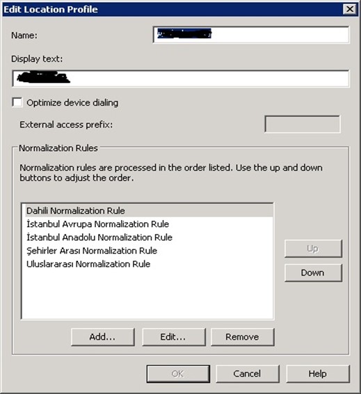 Location Profile de gelen çağrılar normalize edilir. Yani kullanıcı 1140 aradığında Mediation bu çağrıyı 114o olarak algılasın, çağrı xxx xx xx gibi 7 dijit ise başına +90 212 xxx xx xx olarak düzenlesin gibi. Location profile da ad deyip aşağıdaki gibi normalization rule larımı oluşturmamız gerekmekte. Böylece mediation gelen ve giden çağrıları anlayabilecek duruma gelir. Bu rule lar için örnek vermek gerekirse ;