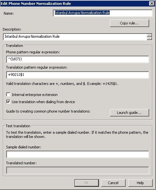 gibi bir ihtiyaca göre bir çok rule oluşturulabilir. Ek te de bu normalization rule lar ile ilgili birkaç örnek bulunmaktadır. İşin zor ve karışık olan tarafıda burasıdır. Açıklamak gerekirse phone pattern regular expressin daki ^ işareti başlama (yukarıdaki örnekte o ile başlayan aramalar demek), \d{7} eğer 7 dijit lik bir arama ise, yani xxx xx xx gibir bir arama olduğunda Translation pattern regular expression daki anlam ise başına (+90212$1) aramanın başına +90212 ı koy demek yani biz xxx xx xx gibi bir arama yaptığımıza yukarıdaki normalization rule lar ile +90212xxxxxxx gibi bir arama yapmış oluruz ve arama mediation ın anlayacağı dile çevrilmiş olur. Buraya kadarki olan ayarlar telefon aramalarının normalize edilmesi ile ilgili idi. Bundan sonra ise kimin hangi aramaları yapacağını ayarlayacağımız yer ile ilgilidir.