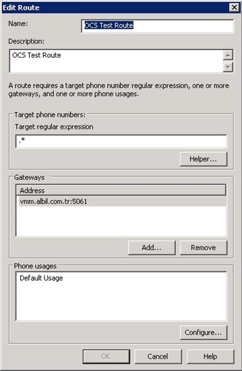 Routes tabında ise .* diyerek bütün aramaları gateways den ise mediation server ımizi seçerek phone usage dan da seçilen usage lar ise çağrılar gerçekleşir.