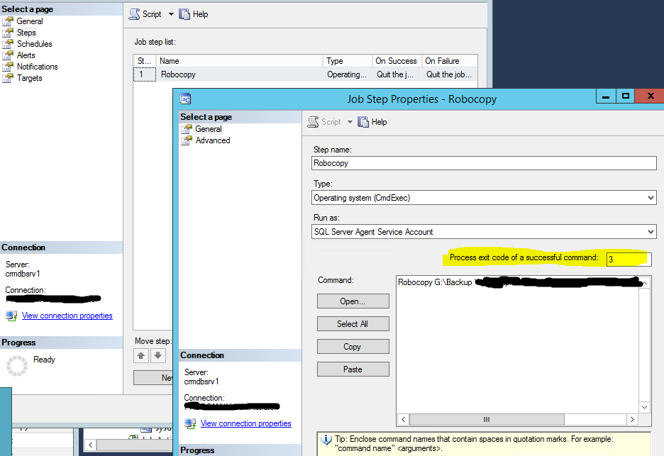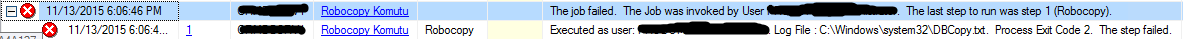 Sql Server da sql task olarak robocopy komunu çalıştığında robocopy nin başarılı çalıtıktan sonra döndüğü exit code 2 SQL task larda default u ile aynı olmadığı için robocoy başarılı olarak çalışması rağmen sql task fail olarak sonlanmakta.