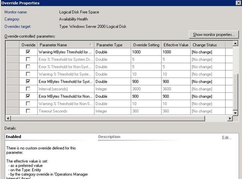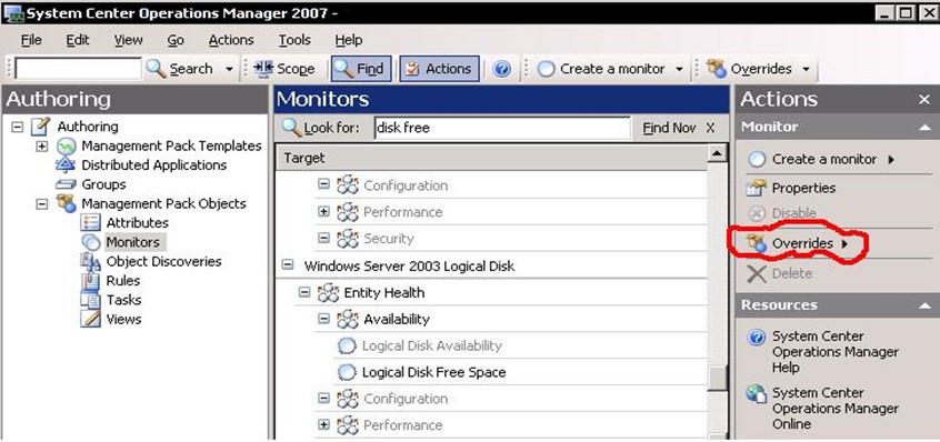 Scom ile sunucuları monitor ettiğimizde disklerin boş alanları belli bir değerin altına indiğinde alertler ertilmektedir. Bu alertleri istediğimiz bir değerlere ekebiliriz. Scom a yüklenen operation system agent lardan veya aşağıdaki gibi var olan managment pack objelerden search ederek ilgili işletim sisteminin-agent ın logical disk space ine gelip sağ tarafta overrides tan default ta gelen ayarları değiştirebiliriz. Bu yöntem ile default ta gelen bütün ayarları değiştirebiliriz.
