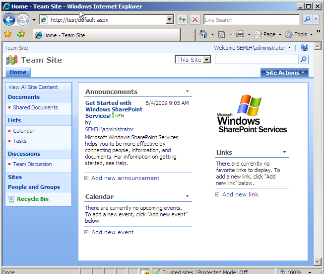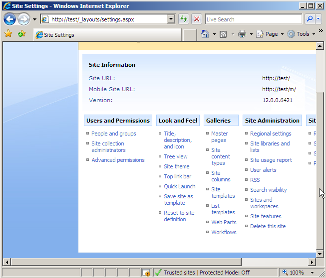 Site ilk kurulduğunda admin dışındakilerin siteyi açma yetkileri yoktur. Bunun için sağ üst köşedeki Site actions a gelip site settings ten Users and Permisions dan istenilen işilere istenilen yetkiler verilmektedir. Sitenin şablonları, içeriği ve görünümü ile ilgili ayarlarda buradan yapılmaktadır. Raporlar, siteyi silme, alertler search gibi bir çok yönetimsel olaylar buradan gerçekleştirilebilir.