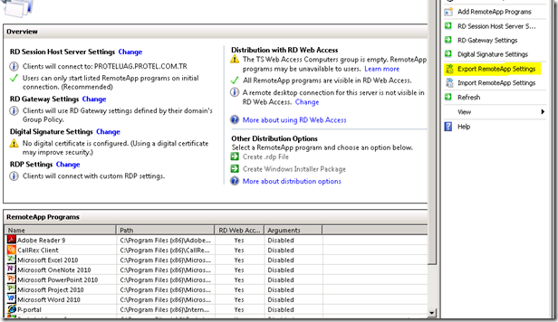 Terminal server 2008 ve r2 üzerinde publish edilen web apps leri uag üzerinden publish edebilmekteyiz. Bu bize merkezi denetim kullanıcılar için ise tek link üzerinden her şeye erişebilme imkanı sağlar. Once terminal üzerinde publish ettiğimiz programların export unu alıyoruz.