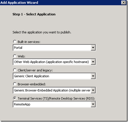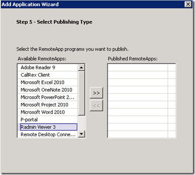 Trunk üzerinde bir application ekleyip bu application da termnial services remoteapp i seçiyorum.
