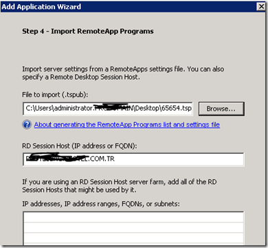 export ettiğimiz dosyayı seçiyoruz. BU dosya da remoteapp ile ilgili bilgiler gözükmektedir. Bu bilgiler aşağıdaki gibidir.