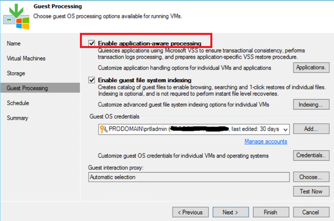 Job oluştururken backup ın application-aware processing seçeneği ile belirtmek gerek.