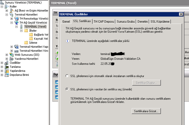 Aktif olarak çalışan bir terminal sunucusunda yüklenmiş olan sertifika aşağıda gözükmektedir. Sertifikayı ise sunucumuza sağ tıklayıp özelliklerinden yükleyebiliyoruz.