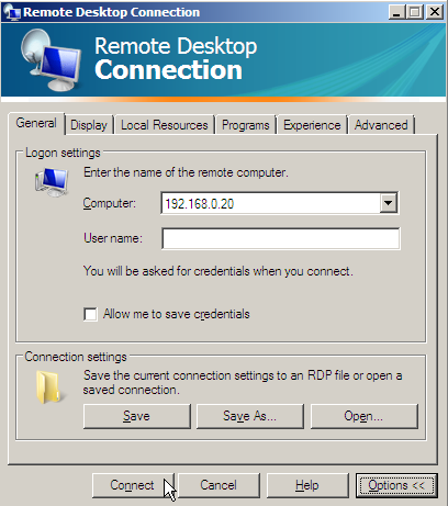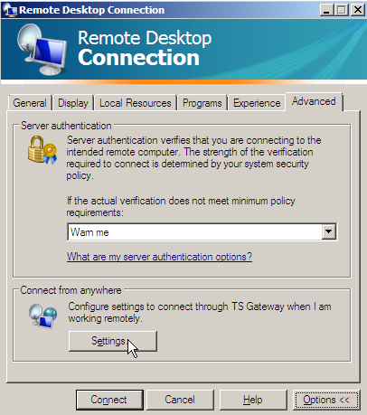 Kullanıcıların dışarından local networklerine bağlanırken, bağlanacak clientların en az RDP 6.0 kullanmaları gerekir. Remote Desktop Connection da advanced a gelip connect from anywhere den settings e gelerek;