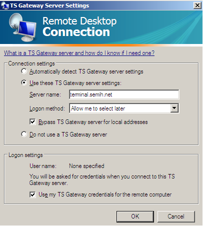 Use these TS Gateway Server settings e terminal server a ulaşacağımız ve sertifika alırken kullandığımız bilisyar ismini buraya giriyoruz. Buraya yazdığımız isim dışarıda DNS leren çözülebilen bir isim olmalı (terminal server ı bu isim ile bulunabilmesi gerek) ve ok diyerek bağlanmak istediğimiz bilgisayarın local IP sini giriyoruz.
