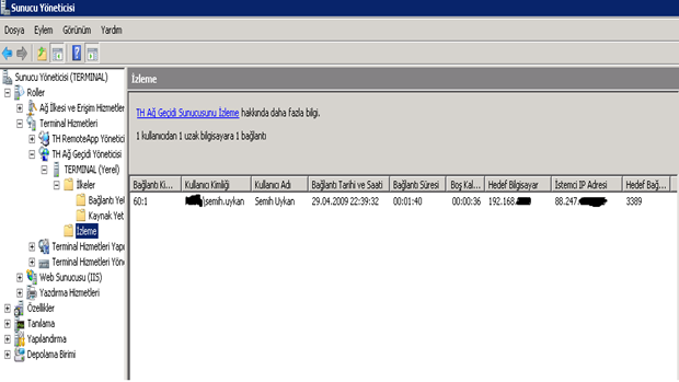 Aşağıda daha önce logon olduğum bir sunucuda kullanıcılar görülmekte. Burada bağlanılan Sunucu, client ın reel Ip si, sunucuya hangi porttan bağlandığı, bağlantıs süreleri gibi özellikler gözükmektedir.
